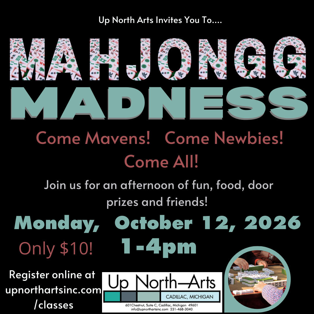 Up North Arts welcomes all Mahjongg players, Newbies to Mavens, for an afternoon of fun and fellowship! Players will need to have their 2026 National Mahjongg League card, and bring a Mahjongg set, if available. Enjoy an afternoon with fellow Mahjongg enthusiasts!