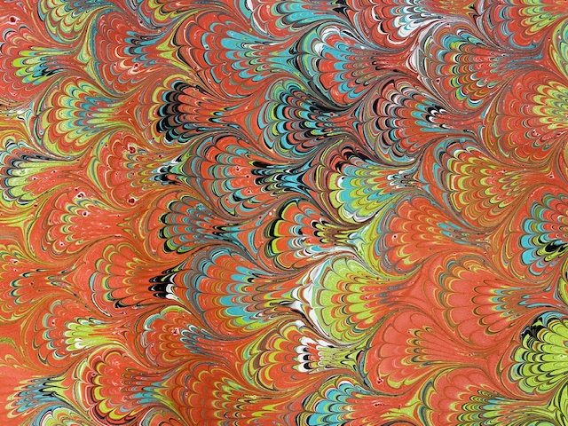 This class is a daylong workshop instructing participants in how to marble on paper, from preparing the surface of the paper and mixing acrylic paint to the right consistency, to floating the paint on thickened water and combing and raking the colors into intricate patterns. You will leave this class with the information and experience needed to marble at home, as well as with 10 to 12 marbled papers of your own design. These papers can be used in future projects, such as endpapers in bookbinding, making one-of-kind note cards, and wrapping small gifts. The morning hours will be spent preparing, then we’ll take a brief (byo) lunch break, and spend the afternoon making the marbled prints.