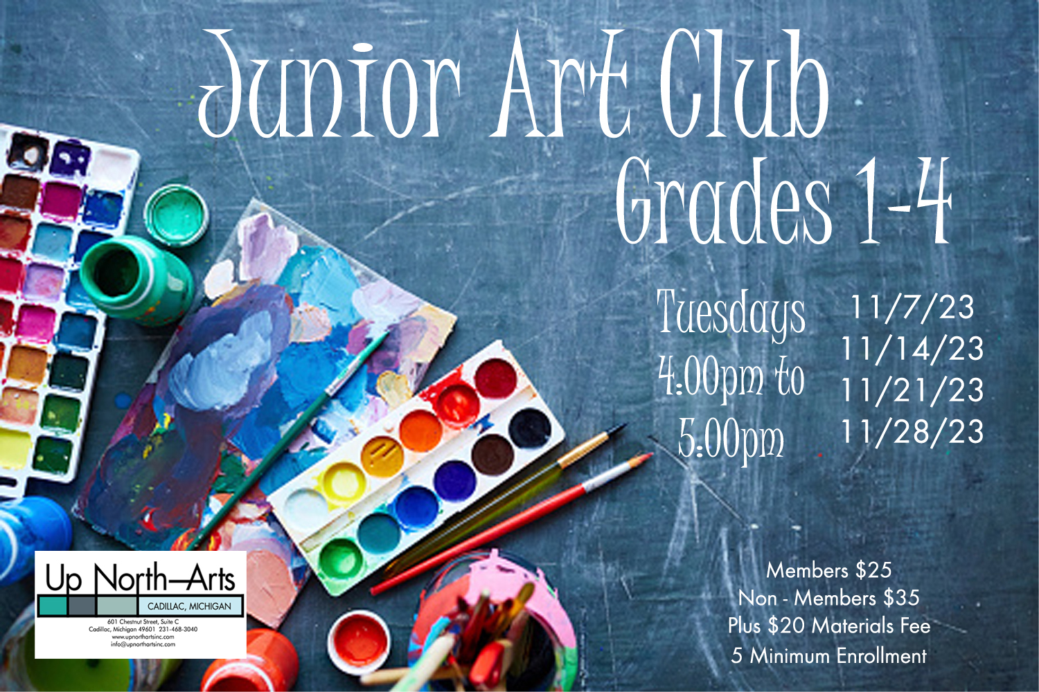 Junior Art Club Club Fall 2023 - Grades 1-4 - 11/7, 14, 21, 28 - 4:00-5:00 pm - REGISTER HERE
